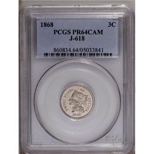 <B>1868 3CN Three Cent Nickel, Judd-618, Pollock-687, R.4, PR64 Cameo PCGS.</B></I> Very similar in design to the contemporary three cent nickel, but the reverse wreath is further from the rims and the denominational columns are not ribbed. Struck in nickel with a plain edge. Each side of this unmarked example has a hint of gold color, and modest white on black contrast is apparent.