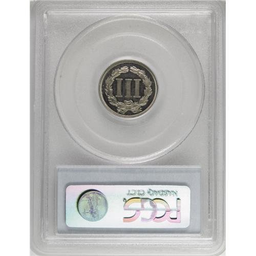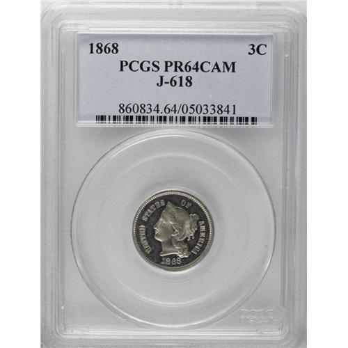 <B>1868 3CN Three Cent Nickel, Judd-618, Pollock-687, R.4, PR64 Cameo PCGS.</B></I> Very similar in design to the contemporary three cent nickel, but the reverse wreath is farther from the rims and the denominational columns are not ribbed. Struck in nickel with a plain edge. Each side of this unmarked example has a hint of gold color, and modest white-on-black contrast is apparent.<BR><BR><b>Shipping:</b> Coin/Currency (<a target="_blank" href="http://www.heritageauctions.com/common/shipping.php">view shipping information</a>)