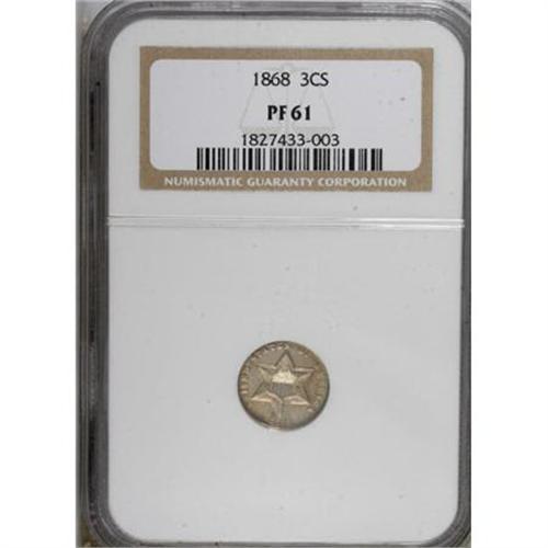 <B>1868 3CS PR61 NGC.</B></I> NGC Census: (2/221). PCGS Population (11/208). Mintage: 600. Numismedia Wsl. Price for NGC/PCGS coin in PR61: $350. (#3718)<BR><BR><B>Coin Engraver:</B> James B. Longacre<BR><BR><b>Shipping:</b> Coins & Currency (<a target="_blank" href="http://www.heritageauctions.com/common/shipping.php">view shipping information</a>)