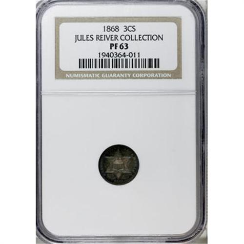 <B>1868 3CS PR63 NGC.</B></I> Ex: Jules Reiver Collection. Vivid blue, pink, and gold iridescence. Virtually all design features are fully and deeply defined, save for one or two leaves on the reverse olive sprig. Only 600+ proofs were struck.<BR><I>Ex: Jules Reiver Collection (Heritage, 1/06), lot 20814.</B></I><BR><BR><B>Coin Engraver:</B> James B. Longacre<BR><BR><b>Shipping:</b> Coins & Currency (<a target="_blank" href="http://www.heritageauctions.com/common/shipping.php">view shipping information</a>)