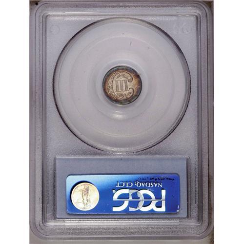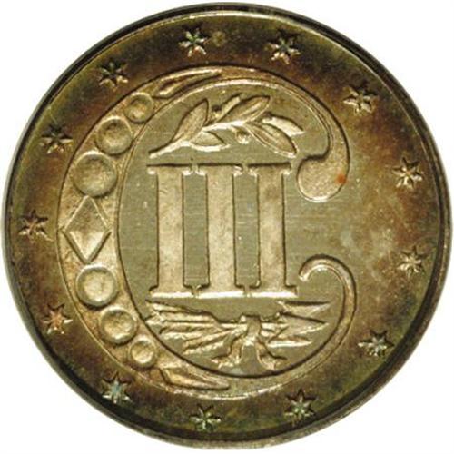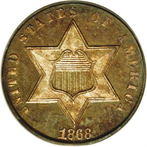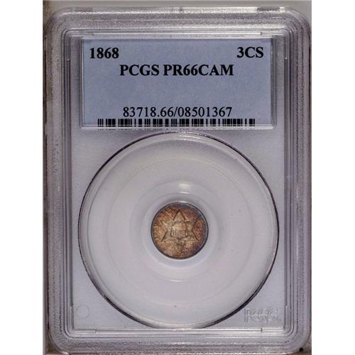 <B>1868<3CS> PR66 Cameo PCGS.</B></I> Some 440 1868 proof three cent silver pieces, from an original proof mintage of 600 coins, have been certified by PCGS and NGC. On the other hand, only 40 '68 proofs have been assigned the Cameo designation. The obverse features a melange of golden-brown, crimson, and cobalt-blue. The reverse displays a similar color pattern, but it is confined to the borders, leaving the center nearly untoned. The design elements are well executed, and the surfaces are nicely preserved. A small lint mark is located beneath the first T of STATES, and what appear to be two fine, short die scratches extend from the lower right portions of the shield. Population: 6 in 66 Cameo, 0 finer (3/06). <BR><BR><B>Important notice:</B> Heritage usually auctions material at the rate of 200-250 lots per hour. On some occasions eBay Live bid software or the Internet may not be able to keep up with the pace of the auction. We recommend placing a realistic absentee bid now as insurance to avoid disappointment. Occasionally the auctioneer may eliminate or reject an eBay Live bid, and the auctioneer may also reopen a lot after the close of the eBay live bidding (usually because we missed an audience bid), and may reject your bid even if it shows you as the winning bidder. By bidding via eBay Live, you agree that Heritage may award the lot to another bidder at its sole discretion under the circumstances described above or any other reasonable circumstances. Since eBay bids are not shown to us until we open the lot on the floor, we treat those bids just like floor bids. In most cases the floor responds before the eBay bid is presented to us, due to Internet lag time, so for consistency we have made it a policy that floor bids are always considered first over tie eBay live bids. Also please note that all Heritage lots purchased through eBay Live carry a 20% Buyer's Premium. Please make sure you read the Terms and Conditions before you bid. This lot is being auctioned in conjunction with a live floor auction by Heritage Galleries & Auctioneers. All final auction and invoice information will be supplied by Heritage Galleries & Auctioneers, and all other information should be considered preliminary. Lot:774 <BR><BR><B>Winning Notification and Billing:</B> After the FINAL session in this auction is complete, Heritage will send e-mail and snail mail invoices. This process normally takes several days. All final auction and invoice information will be supplied by Heritage Galleries & Auctioneers, and all other information should be considered preliminary. <BR><BR>This auction will be conducted on a live auction floor and over the Internet through eBay Live. If you choose to place an absentee bid, please take a moment to <font color='#0000ff'><u><a href='http://pages.ebay.com/liveauctions/help/before/laabsentee.html'>learn how eBay Live absentee bidding works</a></u></font><font color='#000000'>