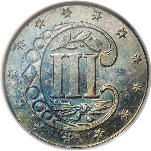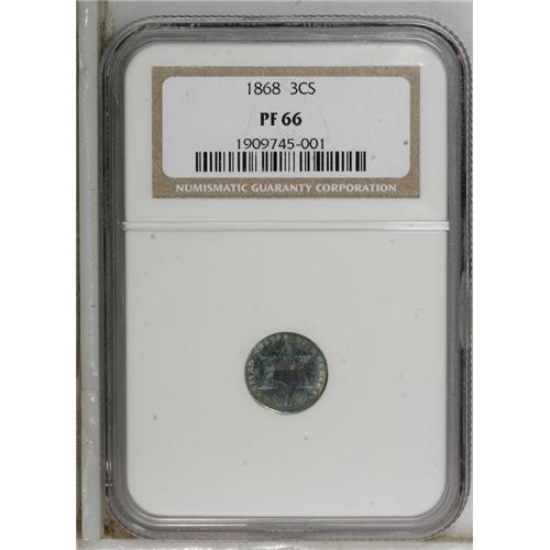 <B>1868 3CS PR66 NGC.</B></I> A rich ocean-blue Premium Gem that has exquisite plum-red and golden-brown patina within the shield. Sharply struck aside from the side shield corners. A scant 600 proofs were made, in addition to only 3,500 business strikes. Census: 14 in 66, 3 finer (4/07).<BR><BR><b>Shipping:</b> Coins & Currency (<a target="_blank" href="http://www.heritageauctions.com/common/shipping.php">view shipping information</a>)