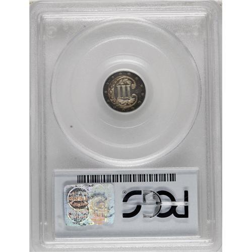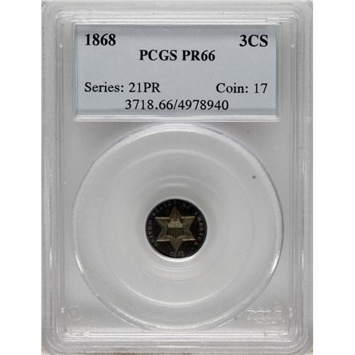 <B>1868 3CS PR66 PCGS.</B></I> The lovely, deep violet-brown, golden-brown, electric-blue and pale gold toning that adorns this Premium Gem proof lends a degree of eye appeal which is far above average for the three cent silver type. Fully struck, carefully preserved, and contact-free, with a few scattered flyspecks that are essentially concealed by the rich patina. Population: 9 in 66, 1 finer (3/07).<BR><BR><b>Shipping:</b> Coins & Currency (<a target="_blank" href="http://www.heritageauctions.com/common/shipping.php">view shipping information</a>)