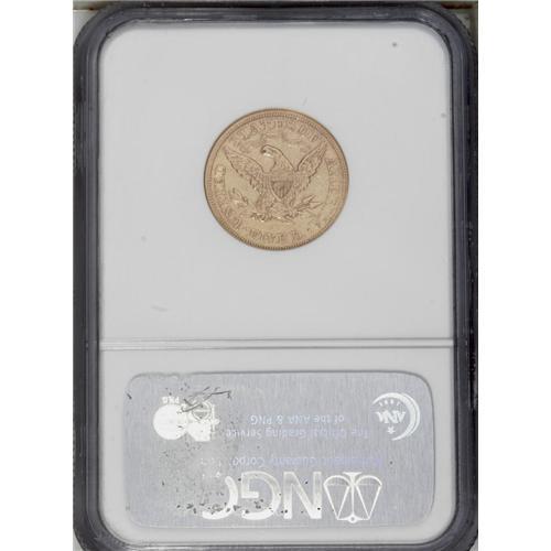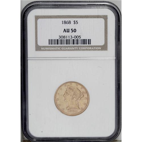 <B>1868<$5> AU50 NGC.</B></I> A scarce issue from a low mintage of 5,700 coins, all struck in mid-January, and apparently all from one pair of dies. A second die pair was utilized for the few Proofs that were struck the following month. Pale pinkish-yellow gold with traces of luster in the protected areas, and hints of greenish coloration on both sides. The surfaces are moderately abraded.