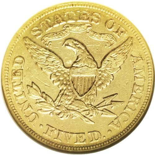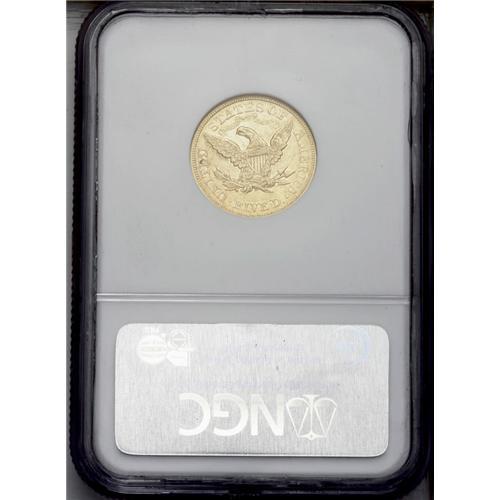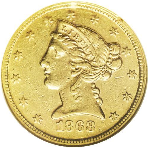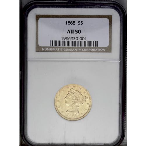 <B>1868 $5 AU50 NGC.</B></I> Gold coins failed to circulate on the East Coast prior to 1878, since they traded at a premium to unbacked Federal currency. Under such circumstances, the Philadelphia Mint produced minimal quantities of gold coins between 1863 and 1877. For the 1868, just 5,700 pieces were struck for this much better Motto issue. A sharp straw-gold example with noticeable luster and moderately abraded fields.<BR><BR><b>Shipping:</b> Coin/Currency (<a target="_blank" href="http://www.heritageauctions.com/common/shipping.php">view shipping information</a>)