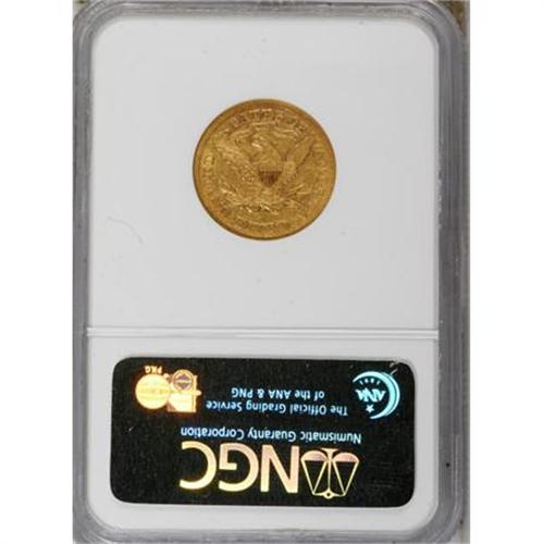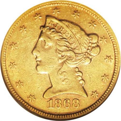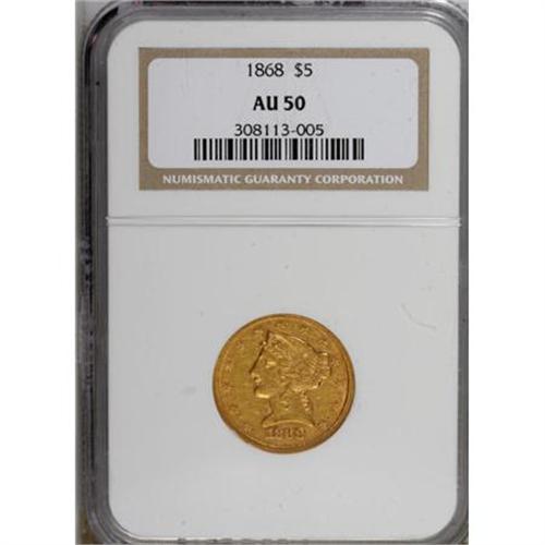 <B>1868 $5 AU50 NGC.</B></I> A scarce issue from a low mintage of 5,700 coins, all struck in mid-January 1868 and apparently all from one pair of dies. A second die pair was utilized for the few proofs that were struck the following month. Pale pinkish-yellow gold with traces of luster in the protected areas, and hints of greenish coloration on both sides. The surfaces are moderately abraded.<BR><BR><B>Coin Engraver:</B> Christian Gobrecht<BR><BR><b>Shipping:</b> Coins & Currency (<a target="_blank" href="http://www.heritageauctions.com/common/shipping.php">view shipping information</a>)