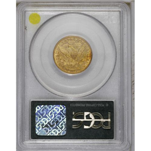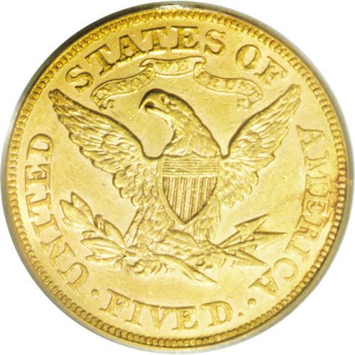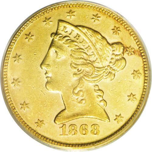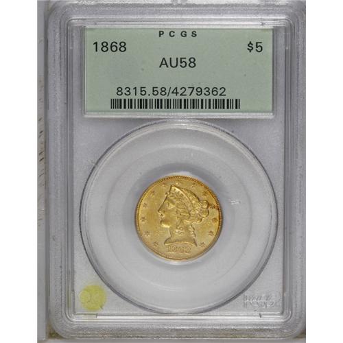 <B>1868<$5> AU58 PCGS.</B></I> A charming and boldly struck example of this elusive issue. The fields are faintly prooflike on this slightly circulated representative, which is one of only 5,700 pieces struck. The lustrous copper-gold surfaces show light abrasions, none singularly noteworthy, with a hint of rub confined to the open fields and the highpoints on each side. The 1868 is very scarce in XF-AU, and becomes a major rarity at the AU58 level. Certified in a green label holder. Population: 1 in 58, 1 finer (8/06).