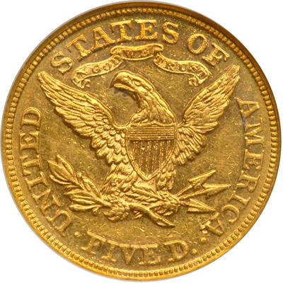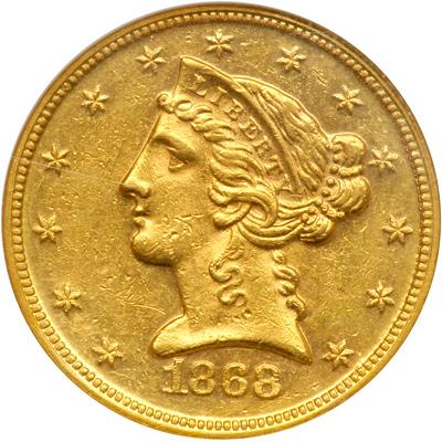 1868 $5 Liberty. NGC graded AU-58. Light golden toning, the surface displays ample luster from a full stike by the dies. We note a few small marks on the cheek. The eagle is especially sharp on the neck feathers and shield (two areas that often subject a Liberty half eagle's grade to close scrutiny) Low mintage year; low NGC census: Pop 14; 2 finer. Only 5,725 pieces struck (PCGS # 8315) .