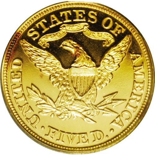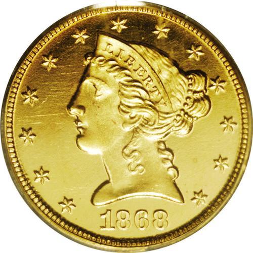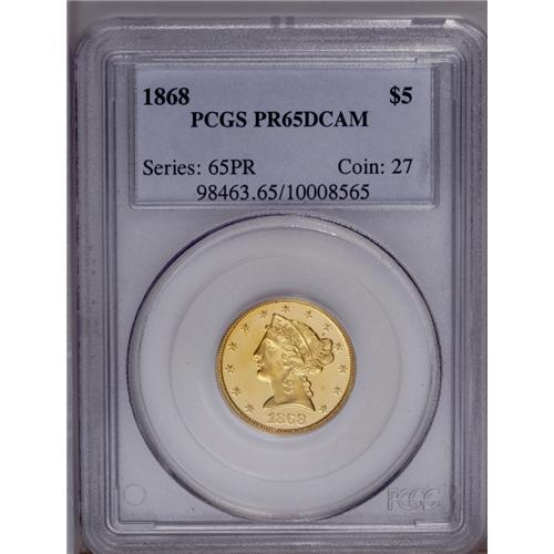 <B>1868 $5 PR65 Deep Cameo PCGS.</B></I> Never before have we offered a Gem Deep Cameo Proof example of this half eagle rarity. It is not known exactly how many Proofs have survived today, but the original mintage of only 25 coins certainly limits the top end of the current population. A total population figure of 10 to 12 coins seems likely. This example is a beauty that will capture the connoisseur's attention. This stunning example has prooflike fields with nearly unfathomable depth, and serving to focus attention on the highly frosted devices. Both sides have rich yellow-gold color with splashes of lilac toning on the reverse. We have not been able to determine the specific pedigree of this beauty, although it should not be hard to make a match, given proper time and resources. A small spot of darker color is directly below the lower left point of star 9, and a short, curved lint mark is visible in the left obverse field, just right of star 4. To the best of our knowledge, this is <I>the first</B></I> time that we have offered a Proof example of this issue in any of our Signature Auctions over the years, a powerful statement given the number of rarities that we have handled.