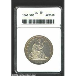 1868 50C AU55 ANACS. Scarce in all grades, the 1868 is a scarcer, low mintage issue with only 418,200 pieces produced. Sharply struck throughout, the fields are bright and semi-reflective with light toning over each side.From the Ohio Collection. Important notice: We expect to be auctioning lots at the rate of 200-250 per hour. Sometimes eBay Premier live bid software cannot keep up with that pace, so we strongly recommend that you place a realistic proxy bid now as insurance to avoid disappointment. Also please note that all Heritage/CAA lots purchased through eBay Premier carry a 20% Buyer's Premium. Please make sure you read the Terms and Conditions.