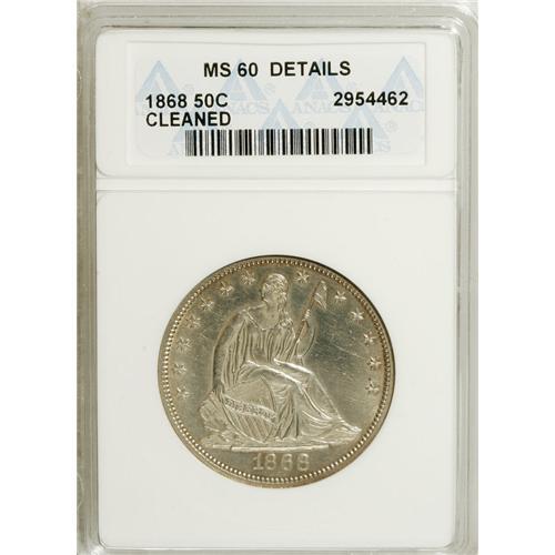 <B>1868 50C --Cleaned--ANACS. MS60 Details.</B></I> NGC Census: (0/16). PCGS Population (1/25). Mintage: 417,600. Numismedia Wsl. Price: $550. (#6323)<BR><BR><b>Shipping:</b> Coins & Currency (<a target="_blank" href="http://www.heritageauctions.com/common/shipping.php">view shipping information</a>)