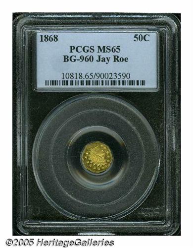 <B>1868<50C> Indian Octagonal 50 Cents, BG-960, R.6, MS65 PCGS.</B></I> Ex: Jay Roe. A bright and flashy honey-gold piece with a slightly grainy texture on the central reverse field, as made. The plate coin in the Second Edition of the standard Breen-Gillio reference.<BR><I>Ex: Jay Roe Collection (Bowers and Merena, 9/03), lot 447, which realized $863.</B></I>