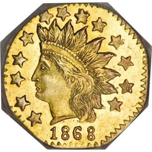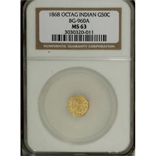<B>1868 50C Indian Octagonal 50 Cents, BG-960A, High R.6, MS63 NGC.</B></I> From the same die pair as the also-rare BG-960, but CAL is mostly effaced. The moderately prooflike fields are unabraded, although the central reverse lacks an absolute strike. Census: 1 in 63, 0 finer (11/07).<BR><BR><b>Shipping:</b> Coins & Currency (<a target="_blank" href="http://www.heritageauctions.com/common/shipping.php">view shipping information</a>)