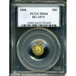 <B>1868 50C Indian Round 50 Cents, BG-1074, R.6, MS64 PCGS.</B></I> A carefully preserved piece that has an interesting lintmark (as struck) in front of the Indian's nose. The strike is better than often seen on this rare variety, since DOLLAR and the fraction are fully legible.