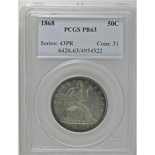 <B>1868 50C PR63 PCGS.</B></I> A thin ring of blue and violet at the periphery gives way to red and orange patina in the center. A moderately reflective and somewhat hazy piece with lightly hairlined fields. Population: 47 in 63, 45 finer (8/06).<BR><I>From The Jones Beach Collection.</B></I><BR><BR><b>Shipping:</b> Coin/Currency (<a target="_blank" href="http://www.heritageauctions.com/common/shipping.php">view shipping information</a>)