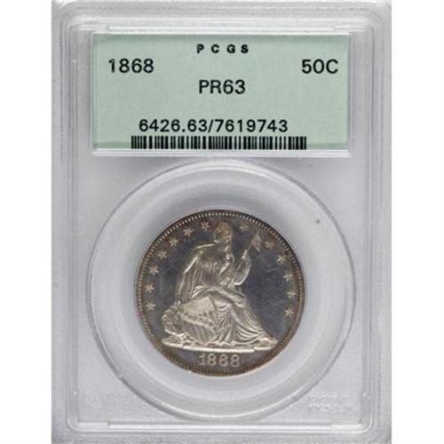 <B>1868 50C PR63 PCGS.</B></I> Golden-brown and rose-red toning deepens along the peripheries. Light mint-made roller marks cross the eagle's neck. A mere 600 proofs were struck. Encased in a green label holder. Population: 47 in 63, 45 finer (4/07).<BR><I>From The Vanek Collection.</B></I><BR><BR><b>Shipping:</b> Coins & Currency (<a target="_blank" href="http://www.heritageauctions.com/common/shipping.php">view shipping information</a>)