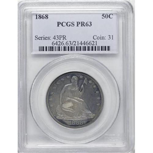 <B>1868 50C PR63 PCGS.</B></I> Fully struck with truly gorgeous dove-gray and purple patina, no obvious contact marks, and just a few wispy hairlines on the reverse. Population: 47 in 63, 45 finer (11/07).<BR><BR><B>Coin Engraver:</B> Christian Gobrecht<BR><BR><b>Shipping:</b> Coins & Currency (<a target="_blank" href="http://www.heritageauctions.com/common/shipping.php">view shipping information</a>)