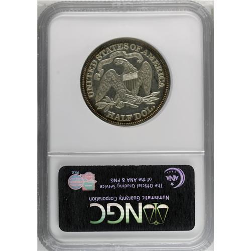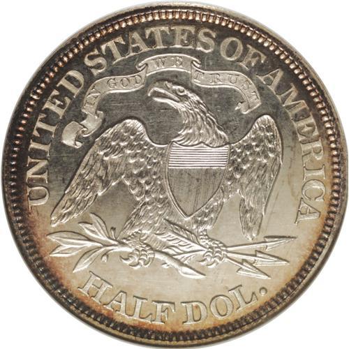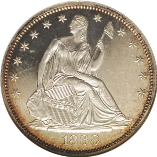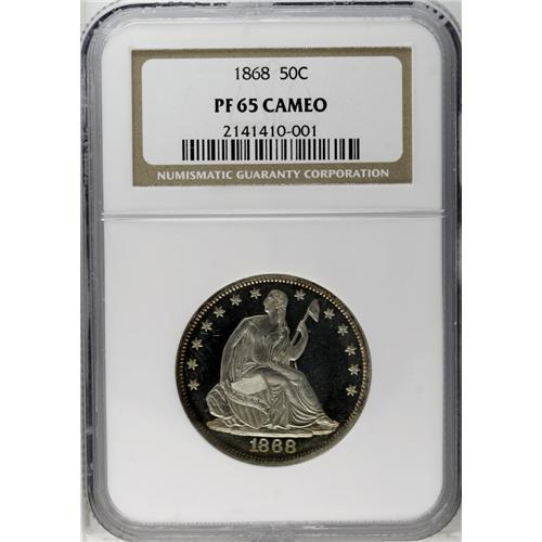 <B>1868<50C> PR65 Cameo NGC.</B></I> Golden-brown bands adorn the margins of this carefully preserved Gem. The strike is crisp, and all devices and legends exhibit obvious frost relative to the glass-like fields. This early Motto proof issue was limited to 600 pieces. Census: 4 in 65 Cameo, 2 finer (6/06).<BR><I>From The Mulholland Collection.</B></I>