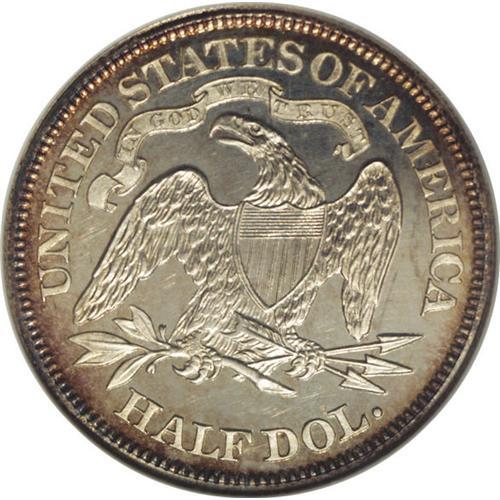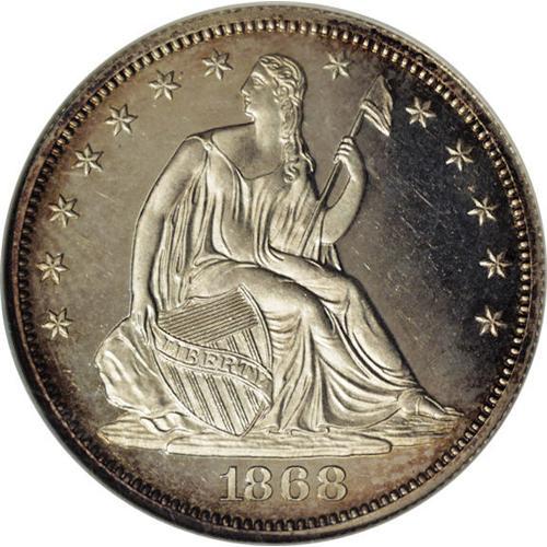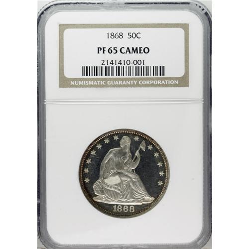 <B>1868 50C PR65 Cameo NGC.</B></I> Golden-brown bands adorn the margins of this carefully preserved Gem. The strike is crisp, and all devices and legends exhibit strong frost relative to the glass-like fields. This early Motto proof issue has a mintage of just 600 pieces, and example of such quality are highly elusive today. Census: 4 in 65 Cameo, 4 finer (12/06).<BR><BR><b>Shipping:</b> Coin/Currency (<a target="_blank" href="http://www.heritageauctions.com/common/shipping.php">view shipping information</a>)