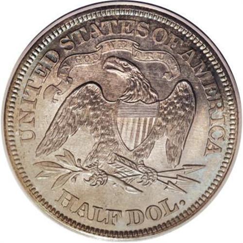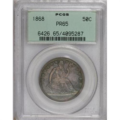 <B>1868 50C PR65 PCGS.</B></I> This flashy and meticulously struck Gem is bathed in ocean-blue and pearl-gray. A few faint mint-made roller marks cross the eagle's neck, but no hairlines are apparent. Encased in an old green label holder. A scant 600 proofs were struck. Population: 7 in 65, 1 finer (8/07).<BR><BR><B>Coin Engraver:</B> Christian Gobrecht<BR><BR><b>Shipping:</b> Coins & Currency (<a target="_blank" href="http://www.heritageauctions.com/common/shipping.php">view shipping information</a>)