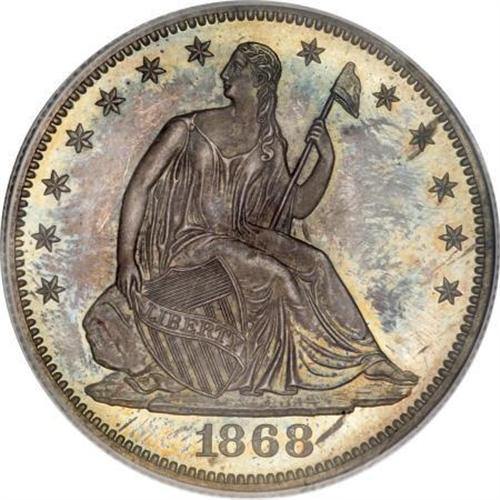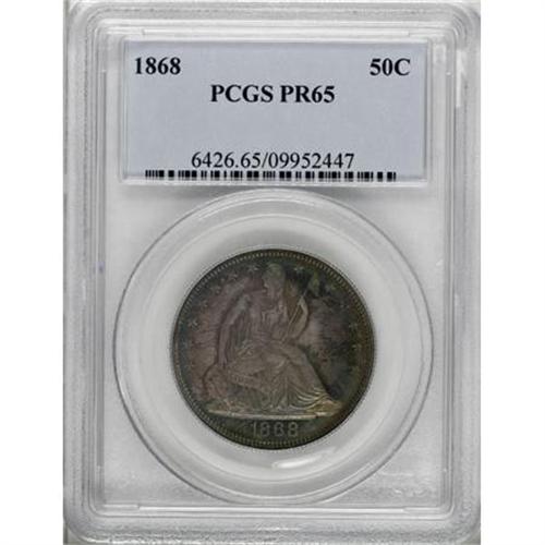 <B>1868 50C PR65 PCGS.</B></I> Bathed in orange-yellow, emerald-green, and peach-lilac, this exactingly struck half dollar is gorgeously toned and exceptionally preserved. Despite the bouquet of colors, the fields remain flashy. A scant 600 proofs were struck. Population: 7 in 65, 1 finer (3/08).<BR><BR><B>Coin Engraver:</B> Christian Gobrecht<BR><BR><b>Shipping:</b> Coins & Currency (<a target="_blank" href="http://www.heritageauctions.com/common/shipping.php">view shipping information</a>)