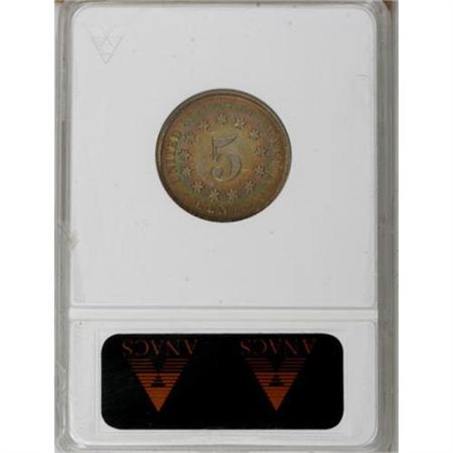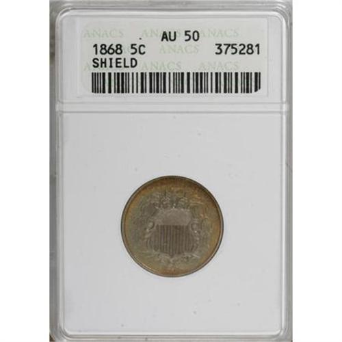 <B>1868 5C AU50 ANACS.</B></I> NGC Census: (1/545). PCGS Population (3/589). Mintage: 28,800,000. Numismedia Wsl. Price for NGC/PCGS coin in AU50: $54. (#3795)<BR><BR><B>Coin Engraver:</B> James B. Longacre<BR><BR><b>Shipping:</b> Coins & Currency (<a target="_blank" href="http://www.heritageauctions.com/common/shipping.php">view shipping information</a>)