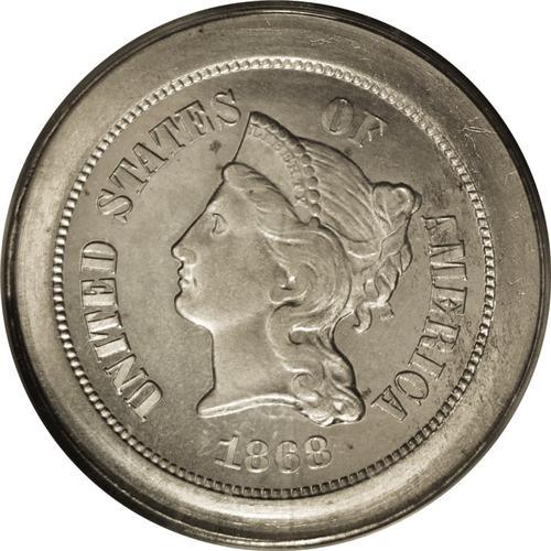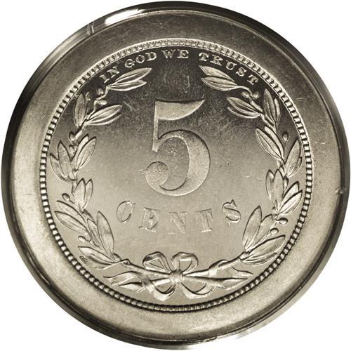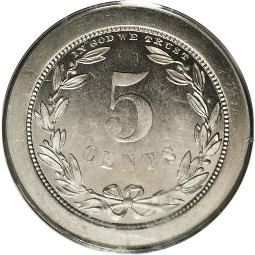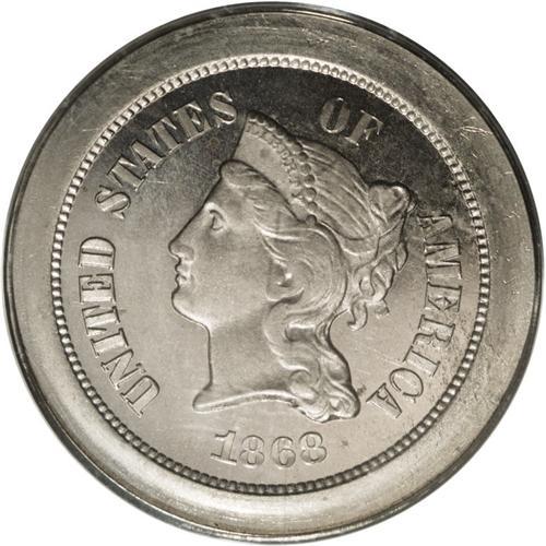 <B>1868 5C Five Cents, Judd-624, Pollock-693, Low R.6, PR65 PCGS.</B></I> Ex: Eliasberg. The obverse bears the Longacre portrait of the issued three cent nickel. The reverse has a peripheral wreath and a centrally placed denomination. IN GOD WE TRUST in minuscule letters crosses the upper border. The rims are unusually broad. Struck in nickel with a plain edge. An untoned Gem that is well preserved aside from a couple of trivial gray obverse spots. The centers show moderate softness, and faint retained laminations are noted on the right obverse. Certified in a green label holder.<BR><I>Ex: Louis E. Eliasberg, Sr. Collection (Bowers and Merena, 5/96), lot 176; Waterbury Collection (Bowers and Merena, 1/03), lot 950.</B></I><BR><BR><b>Shipping:</b> Coin/Currency (<a target="_blank" href="http://www.heritageauctions.com/common/shipping.php">view shipping information</a>)
