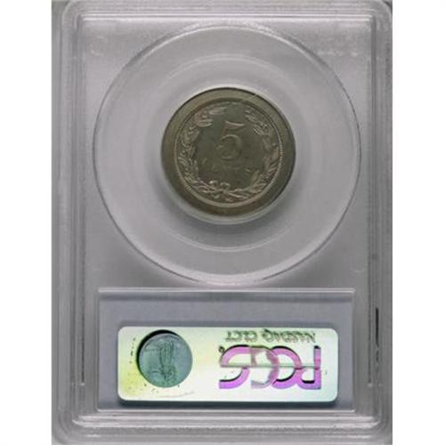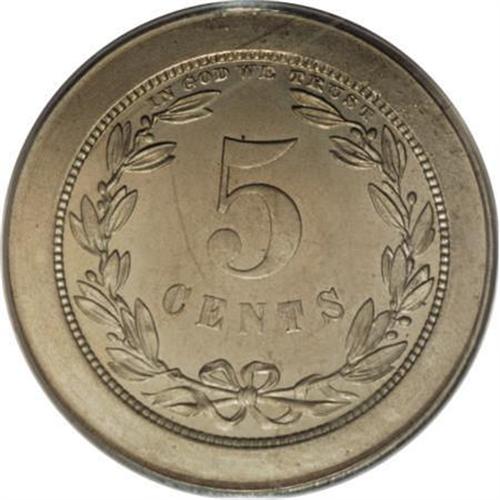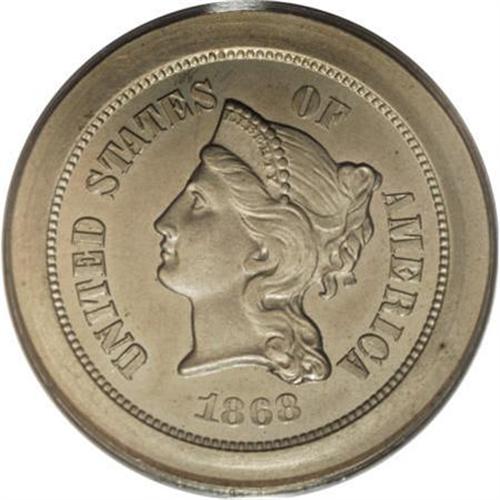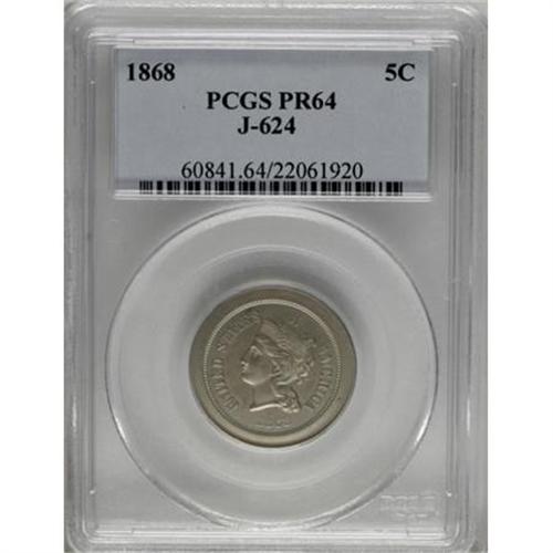 <B>1868 5C Five Cents, Judd-624, Pollock-693, Low R.6, PR64 PCGS.</B></I> The obverse bears the Longacre portrait of the issued three cent nickel. The reverse has a peripheral wreath and a centrally placed denomination. IN GOD WE TRUST in minuscule letters crosses the upper border. The rims are unusually broad. Struck in nickel with a plain edge. Each side is draped with even gray-rose patina. Well, but not deeply mirrored. The denomination on the reverse is weakly brought up, perhaps showing an inherent weakness in this design.<BR><BR><b>Shipping:</b> Coins & Currency (<a target="_blank" href="http://www.heritageauctions.com/common/shipping.php">view shipping information</a>)