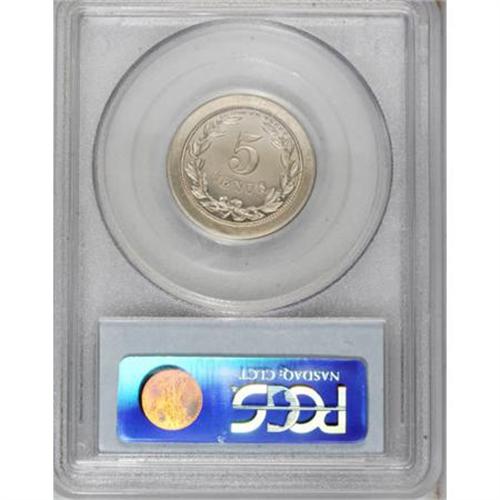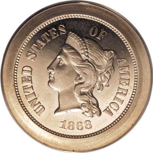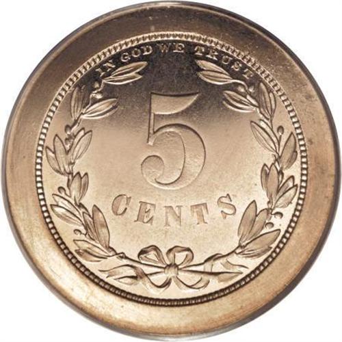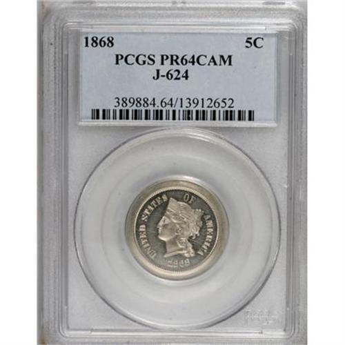<B>1868 5C Five Cents, Judd-624, Pollock-693, Low R.6, PR64 Cameo PCGS.</B></I> The obverse bears the Longacre portrait of the issued three cent nickel. The reverse has a peripheral wreath and a centrally placed denomination. IN GOD WE TRUST in minuscule letters crosses the upper border. The rims are unusually broad. Struck in nickel with a plain edge. The surfaces are brilliant and the obverse fields display pronounced evidence of die striations, while the reverse fields show very little. Noticeably contrasted on each side. Sharply defined and essentially problem-free, this piece appears finer than the stated grade. <BR><BR><b>Shipping:</b> Coins & Currency (<a target="_blank" href="http://www.heritageauctions.com/common/shipping.php">view shipping information</a>)