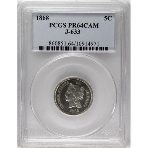 <B>1868 5C Five Cents, Judd-633, Pollock-705, R.5, PR64 PCGS.</B></I> The bust of Liberty is in profile view facing left, wearing a coronet with a star. The date is below and the statutory legend is around, along the border. The reverse has a wreath joined at the top by a scroll bearing IN GOD WE TRUST. Above is a small Maltese Cross. Struck in nickel with a plain edge. The High Date Pollock variety of Judd-633. Although slightly weak at the centers, both sides of this near-Gem have attractive light gray surfaces with fully mirrored fields.<BR><I>From The Dale A. Konigsburg Collection.</B></I><BR><BR><b>Shipping:</b> Coin/Currency (<a target="_blank" href="http://www.heritageauctions.com/common/shipping.php">view shipping information</a>)