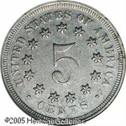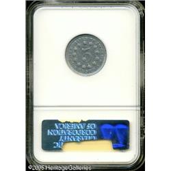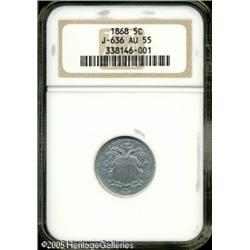 <B>1868 5C Five Cents, Judd-636, Pollock-708, Low R.7, AU55 NGC.</B></I> This die trials piece uses regular issue dies and has the usual plain edge, but it is struck in aluminum rather than the usual nickel alloy. A nicely struck specimen with some remaining flash in protected areas. A few scattered tiny marks and slight highpoint friction point to brief circulation before its retrieval by a forward-thinking individual. Very rare, a perusal of Heritage auction records does not produce a prior appearance. As of (1/05), the only example of Judd-636 certified by NGC. Lot:9844