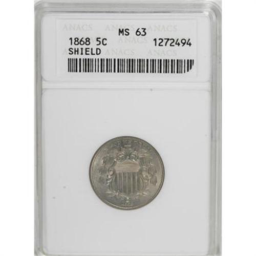 <B>1868 5C MS63 ANACS.</B></I> MS63. NGC Census: (84/362). PCGS Population (131/312). Mintage: 28,800,000. Numismedia Wsl. Price for NGC/PCGS coin in MS63: $152. (#3795)<BR><BR><B>Coin Engraver:</B> James B. Longacre<BR><BR><b>Shipping:</b> Coins & Currency (<a target="_blank" href="http://www.heritageauctions.com/common/shipping.php">view shipping information</a>)