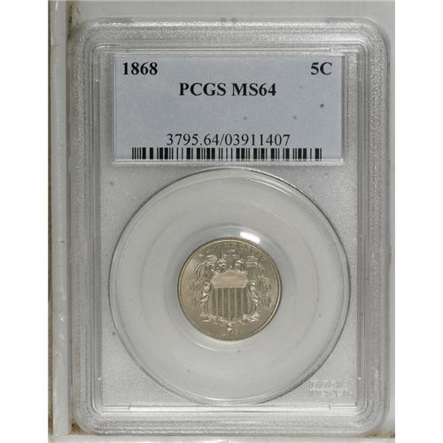<B>1868 5C MS64 PCGS.</B></I> PCGS Population (207/92). NGC Census: (203/152). Mintage: 28,800,000. Numismedia Wsl. Price for NGC/PCGS coin in MS64: $252. (#3795)<BR><BR><b>Shipping:</b> Coins & Currency (<a target="_blank" href="http://www.heritageauctions.com/common/shipping.php">view shipping information</a>)