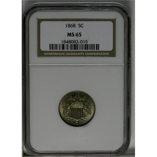 <B>1868<5C> MS65 NGC.</B></I> Patches of gold-green toning appear on the obverse and reverse. This well struck Gem would be a fine addition to a 19th-century type set.<BR><I>From The Redfjord Collection.</B></I>