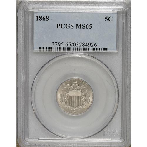 1868 5C MS65 PCGS. Lustrous silver-gray surfaces revea