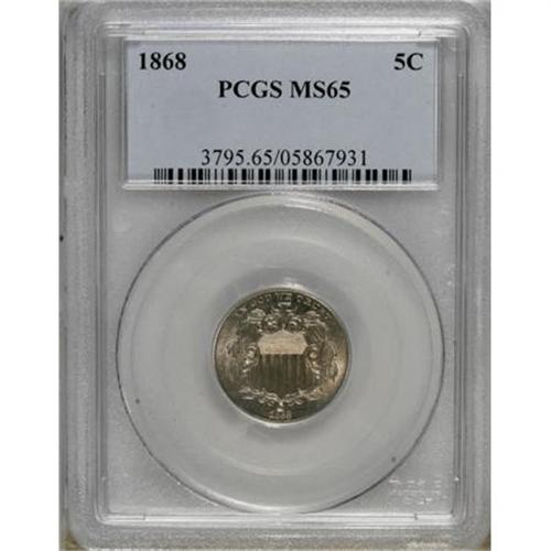 <B>1868 5C MS65 PCGS.</B></I> Reverse of 1868. Strongly lustrous for this popular type issue with boldly impressed devices. The nickel-gray surfaces show occasional blushes of gold and rose at the centers. Population: 68 in 65, 25 finer (3/08).<BR><BR><B>Coin Engraver:</B> James B. Longacre<BR><BR><b>Shipping:</b> Coins & Currency (<a target="_blank" href="http://www.heritageauctions.com/common/shipping.php">view shipping information</a>)