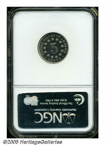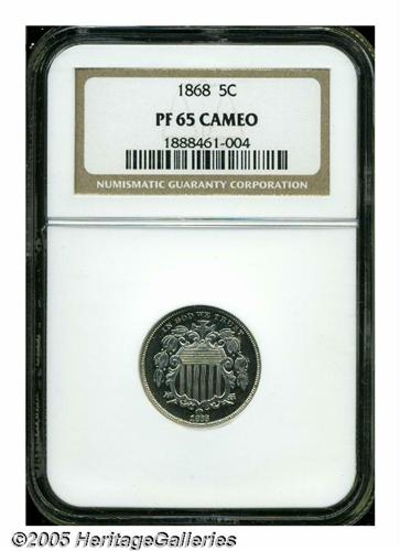 <B>1868<5C> PR65 Cameo NGC.</B></I> This nearly untoned shield nickel proof displays moderate cameo contrast. The design elements are exquisitely struck, and there are no significant contact marks apparent over each side. Nice all around eye appeal. Population: 7 in 65, 10 finer (4/05).