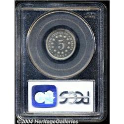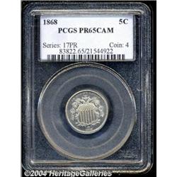<B>1868<5C> PR65 Cameo PCGS.</B></I> The date is lightly repunched, most noticeably within the loops of the second 8. A well struck Gem that has light hazy patina and modest cameo contrast. The surfaces are carefully preserved. Population: 8 in 65 Cameo, 5 finer (3/04). <BR><BR><B>Important notice:</B> Heritage usually auctions material at the rate of 200-250 lots per hour. On some occasions eBay Live bid software or the Internet may not be able to keep up with the pace of the auction. We recommend placing a realistic absentee bid now as insurance to avoid disappointment. Occasionally the auctioneer may eliminate or reject an eBay Live bid, and the auctioneer may also reopen a lot after the close of the eBay live bidding (usually because we missed an audience bid), and may reject your bid even if it shows you as the winning bidder. By bidding via eBay Live, you agree that Heritage may award the lot to another bidder at its sole discretion under the circumstances described above or any other reasonable circumstances. Since eBay bids are not shown to us until we open the lot on the floor, we treat those bids just like floor bids. In most cases the floor responds before the eBay bid is presented to us, due to Internet lag time, so for consistency we have made it a policy that floor bids are always considered first over tie eBay live bids. Also please note that all Heritage lots purchased through eBay Live carry a 20% Buyer's Premium. Please make sure you read the Terms and Conditions before you bid.