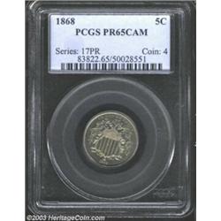 <TR><TD width="100%"><TABLE cellSpacing=1 cellPadding=3 width="100%" border=0><TBODY><TR><TD width="100%" bgColor=#79735c><FONT face=arial color=#ffffff size=3><B>Description</B> </FONT></TD></TR><TR><TD width="100%" bgColor=#ffffff><FONT face=arial size=2><B>1868 5C PR65 Cameo PCGS.</B></I> Watery, carbon-free surfaces are draped in milky steel-blue patina in addition to a dash of apricot color along the reverse periphery. Population: 7 in 65 Cameo, 3 finer (4/03). </FONT></TD></TR></TBODY></TABLE></TD></TR></TBODY></TABLE><BR><A name=PricesRealized></A><TABLE cellSpacing=0 cellPadding=0 width="100%" bgColor=#000000 border=0><TBODY><TR><TD width="100%"><TABLE cellSpacing=1 cellPadding=3 width="100%" border=0><TBODY><TR><TD width="100%" bgColor=#79735c><A name=PR><FONT face=arial color=#ffffff size=3><B>Previous Prices from Heritage Auctions</B> </FONT></A></TD></TR><TR><TD bgColor=#f6f6ed><TABLE cellSpacing=0 cellPadding=0 width="100%" border=1><TBODY><TR><TD align=middle width="33%"><B>Date</B></TD><TD align=middle width="33%"><B>Service</B></TD><TD align=middle width="33%"><B>Price</B></TD></TR><TR bgColor=whitesmoke><TD width="33%"><B>03/01/2003</B></TD><TD width="33%">PCGS</TD><TD width="33%">$1,380.00</TD></TR><TR bgColor=whitesmoke><TD width="33%"><B>05/31/2003</B></TD><TD width="33%">PCGS</TD><TD width="33%">$1,552.50</TD></TR><TR bgColor=whitesmoke><TD width="33%"><B>07/30/2002</B></TD><TD width="33%">PCGS</TD><TD width="33%">$1,380.00</TD></TR><TR bgColor=whitesmoke><TD width="33%"><B>02/23/2002</B></TD><TD width="33%">NGC</TD><TD width="33%">$977.50</TD></TR><TR bgColor=whitesmoke><TD width="33%"><B>02/23/2001</B></TD><TD width="33%">NGC</TD><TD width="33%">$1,063.75</TD></TR></TBODY></TABLE></TD></TR><TR><TD bgColor=#ffffff><FONT face=arial size=1 ?>PLEASE NOTE: All prices realized reflect the final hammer price PLUS the buyer's premium in auctions that charge a buyer's premium. Each item has a notation at the top of the listing indicating whether that lot included a buyer's premium. Example: A item that sells with a final hammer price of $100 and a 20% buyer's premium will display with a price realized of $120. All information listed is intended to be as accurate as possible, but errors are possible. Please use this guide carefully and inform us of any inaccuracies. </FONT></TD></TR></TBODY></TABLE></TD></TR></TBODY></TABLE><BR><TABLE cellSpacing=0 cellPadding=0 width="100%" bgColor=#000000 border=0><TBODY><TR><TD width="100%"><TABLE cellSpacing=1 cellPadding=3 width="100%" border=0><TBODY><TR><TD width="100%" bgColor=#79735c colSpan=6><FONT face=arial color=#ffffff size=3><B>Price Guide*</B> </FONT></TD></TR><TR bgColor=#f6f6ed><TD align=middle><B>Grade</B> </TD><TD align=middle><B>Coin World<BR>(Trends)</B> </TD><TD align=middle><B>Numismedia<BR>Retail</B> </TD><TD align=middle><B>Numismedia<BR>Wholesale</B> </TD><TD align=middle><B>Coin<BR>Universe</B> </TD><TD align=middle><B>Heritage<BR>Value Index</B> </TD></TR><TR bgColor=#ffffff><TD align=middle>64</TD><TD align=right>---</TD><TD align=right>---</TD><TD align=right>---</TD><TD align=right>---</TD><TD align=right>$536.25</TD></TR><TR style="FONT-WEIGHT: bold" bgColor=#cccfdd><TD align=middle>65</TD><TD align=right>---</TD><TD align=right>---</TD><TD align=right>---</TD><TD align=right>---</TD><TD align=right>$1,293.75</TD></TR><TR bgColor=#ffffff><TD align=middle>66</TD><TD align=right>---</TD><TD align=right>---</TD><TD align=right>---</TD><TD align=right>---</TD><TD align=right>---</TD></TR><TR bgColor=#ffffff><TD colSpan=6><FONT size=1>*All information listed is intended to be as accurate as possible, but errors are possible. No item may be returned or refused based on this information which is provided as a service to our customers. You should contact each pricing source directly to determine the accuracy of this information. </FONT></TD></TR></TBODY></TABLE></TD></TR></TBODY></TABLE><BR><TABLE cellSpacing=0 cellPadding=0 width="100%" bgColor=#000000 border=0><TBODY><TR><TD width="100%"><TABLE cellSpacing=1 cellPadding=3 width="100%" border=0><TBODY><TR><TD width="100%" bgColor=#79735c><FONT face=arial color=#ffffff size=3><B>Population Guide</B> </FONT></TD></TR><TR bgColor=#ffffff><TD align=middle><!-- Begin Output of Population Grid--><TABLE cellSpacing=0 cellPadding=0 width="100%" border=0><TBODY><TR><TD vAlign=center><TABLE cellSpacing=0 width="100%" border=1 cellsadding="3"><TBODY><TR><TD vAlign=center><TABLE cellSpacing=0 cellPadding=3 width="100%" border=1><TBODY><TR><TD vAlign=center align=middle bgColor=#f0f1e8 colSpan=2 <CENTER><FONT face=Arial size=2><B>PCGS Pop </B></FONT><CENTER></CENTER></TD><TD vAlign=center align=middle bgColor=#f0f1e8 colSpan=2><CENTER><FONT face=Arial size=2><B>NGC Pop</B></CENTER></FONT></TD></TR><TR><TD vAlign=center><FONT face=Arial size=2>(65)</FONT> </TD><TD vAlign=center align=right><FONT face=Arial size=2>7</FONT> </TD><TD vAlign=center><FONT face=Arial size=2>(65)</FONT> </TD><TD vAlign=center align=right><FONT face=Arial size=2>3</FONT> </TD></TR><TR><TD vAlign=center><FONT face=Arial size=2>(>65)</FONT> </TD><TD vAlign=center align=right><FONT face=Arial size=2>3</FONT> </TD><TD vAlign=center><FONT face=Arial size=2>(>65)</FONT> </TD><TD vAlign=center align=right><FONT face=Arial size=2>4</FONT> </TD></TR></TBODY></TABLE></TD></TR></TBODY></TABLE></TD></TR></TBODY></TABLE><!-- End Output of Population Grid--></TD></TR></TBODY></TABLE></TD></TR></TBODY></TABLE><BR><TABLE cellSpacing=0 cellPadding=0 width="100%" bgColor=#000000 border=0><TBODY><TR> Important notice: We expect to be auctioning lots at the rate of 200-250 per hour. On occasion eBay live bid software cannot keep up with the pace of the auctions where 4-5 lots per minute can hammer down, so we recommend that you place a realistic absentee bid now as insurance to avoid disappointment. Also please note that all Heritage/CAA lots purchased through eBay Live carry a 20% Buyer's Premium. Please make sure you read