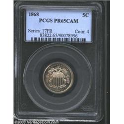 <TABLE cellSpacing=0 cellPadding=0 width="100%" bgColor=#000000 border=0><TBODY><TR><TD width="100%"><TABLE cellSpacing=1 cellPadding=3 width="100%" border=0><TBODY><TR><TD width="100%" bgColor=#79735c><FONT face=arial color=#ffffff size=3><B>Description</B> </FONT></TD></TR><TR><TD width="100%" bgColor=#ffffff><FONT face=arial size=2><B>1868 5C PR65 Cameo PCGS.</B></I> The second 8 in the date is widely repunched. A blush of golden-brown color visits selected areas of this carefully preserved Gem. The right reverse border has a series of tiny mint-made planchet flaws that have no effect on the eye appeal. Population: 3 in 65 Cameo, 3 finer (8/03). </FONT></TD></TR></TBODY></TABLE></TD></TR></TBODY></TABLE><BR><A name=PricesRealized></A><TABLE cellSpacing=0 cellPadding=0 width="100%" bgColor=#000000 border=0><TBODY><TR><TD width="100%"><TABLE cellSpacing=1 cellPadding=3 width="100%" border=0><TBODY><TR><TD width="100%" bgColor=#79735c><A name=PR><FONT face=arial color=#ffffff size=3><B>Previous Prices from Heritage Auctions</B> </FONT></A></TD></TR><TR><TD bgColor=#f6f6ed><TABLE cellSpacing=0 cellPadding=0 width="100%" border=1><TBODY><TR><TD align=middle width="33%"><B>Date</B></TD><TD align=middle width="33%"><B>Service</B></TD><TD align=middle width="33%"><B>Price</B></TD></TR><TR bgColor=whitesmoke><TD width="33%"><B>03/01/2003</B></TD><TD width="33%">PCGS</TD><TD width="33%">$1,380.00</TD></TR><TR bgColor=whitesmoke><TD width="33%"><B>07/29/2003</B></TD><TD width="33%">PCGS</TD><TD width="33%">$1,552.50</TD></TR><TR bgColor=whitesmoke><TD width="33%"><B>07/30/2002</B></TD><TD width="33%">PCGS</TD><TD width="33%">$1,380.00</TD></TR><TR bgColor=whitesmoke><TD width="33%"><B>02/23/2001</B></TD><TD width="33%">NGC</TD><TD width="33%">$1,063.75</TD></TR></TBODY></TABLE></TD></TR><TR><TD bgColor=#ffffff><FONT face=arial size=1 ?>PLEASE NOTE: All prices realized reflect the final hammer price PLUS the buyer's premium in auctions that charge a buyer's premium. Each item has a notation at the top of the listing indicating whether that lot included a buyer's premium. Example: A item that sells with a final hammer price of $100 and a 20% buyer's premium will display with a price realized of $120. All information listed is intended to be as accurate as possible, but errors are possible. Please use this guide carefully and inform us of any inaccuracies. </FONT></TD></TR></TBODY></TABLE></TD></TR></TBODY></TABLE><BR><TABLE cellSpacing=0 cellPadding=0 width="100%" bgColor=#000000 border=0><TBODY><TR><TD width="100%"><TABLE cellSpacing=1 cellPadding=3 width="100%" border=0><TBODY><TR><TD width="100%" bgColor=#79735c colSpan=6><FONT face=arial color=#ffffff size=3><B>Price Guide*</B> </FONT></TD></TR><TR bgColor=#f6f6ed><TD align=middle><B>Grade</B> </TD><TD align=middle><B>Coin World<BR>(Trends)</B> </TD><TD align=middle><B>Numismedia<BR>Retail</B> </TD><TD align=middle><B>Numismedia<BR>Wholesale</B> </TD><TD align=middle><B>Coin<BR>Universe</B> </TD><TD align=middle><B>Heritage<BR>Value Index</B> </TD></TR><TR bgColor=#ffffff><TD align=middle>64</TD><TD align=right>---</TD><TD align=right>---</TD><TD align=right>---</TD><TD align=right>---</TD><TD align=right>$536.25</TD></TR><TR style="FONT-WEIGHT: bold" bgColor=#cccfdd><TD align=middle>65</TD><TD align=right>---</TD><TD align=right>---</TD><TD align=right>---</TD><TD align=right>---</TD><TD align=right>$1,293.75</TD></TR><TR bgColor=#ffffff><TD align=middle>66</TD><TD align=right>---</TD><TD align=right>---</TD><TD align=right>---</TD><TD align=right>---</TD><TD align=right>---</TD></TR><TR bgColor=#ffffff><TD colSpan=6><FONT size=1>*All information listed is intended to be as accurate as possible, but errors are possible. No item may be returned or refused based on this information which is provided as a service to our customers. You should contact each pricing source directly to determine the accuracy of this information. </FONT></TD></TR></TBODY></TABLE></TD></TR></TBODY></TABLE><BR><TABLE cellSpacing=0 cellPadding=0 width="100%" bgColor=#000000 border=0><TBODY><TR><TD width="100%"><TABLE cellSpacing=1 cellPadding=3 width="100%" border=0><TBODY><TR><TD width="100%" bgColor=#79735c><FONT face=arial color=#ffffff size=3><B>Population Guide</B> </FONT></TD></TR><TR bgColor=#ffffff><TD align=middle><!-- Begin Output of Population Grid--><TABLE cellSpacing=0 cellPadding=0 width="100%" border=0><TBODY><TR><TD vAlign=center><TABLE cellSpacing=0 width="100%" border=1 cellsadding="3"><TBODY><TR><TD vAlign=center><TABLE cellSpacing=0 cellPadding=3 width="100%" border=1><TBODY><TR><TD vAlign=center align=middle bgColor=#f0f1e8 colSpan=2 <CENTER><FONT face=Arial size=2><B>PCGS Pop </B></FONT><CENTER></CENTER></TD><TD vAlign=center align=middle bgColor=#f0f1e8 colSpan=2><CENTER><FONT face=Arial size=2><B>NGC Pop</B></CENTER></FONT></TD></TR><TR><TD vAlign=center><FONT face=Arial size=2>(65)</FONT> </TD><TD vAlign=center align=right><FONT face=Arial size=2>3</FONT> </TD><TD vAlign=center><FONT face=Arial size=2>(65)</FONT> </TD><TD vAlign=center align=right><FONT face=Arial size=2>3</FONT> </TD></TR><TR><TD vAlign=center><FONT face=Arial size=2>(>65)</FONT> </TD><TD vAlign=center align=right><FONT face=Arial size=2>3</FONT> </TD><TD vAlign=center><FONT face=Arial size=2>(>65)</FONT> </TD><TD vAlign=center align=right><FONT face=Arial size=2>4</FONT> </TD></TR></TBODY></TABLE></TD></TR></TBODY></TABLE></TD></TR></TBODY></TABLE><!-- End Output of Population Grid--> Important notice: Heritage usually auctions material at the rate of 200-250 lots per hour. On some occasions eBay Live bid software or the Internet may not be able to keep up with the pace of the auction. We recommend placing a realistic absentee bid now as insurance to avoid disappointment. Occasionally the auctioneer may eliminate or reject an eBay Live bid, and the auctioneer may also reopen a lot after the close of the eBay live bidding (usually because we missed an audience bid), and may reje