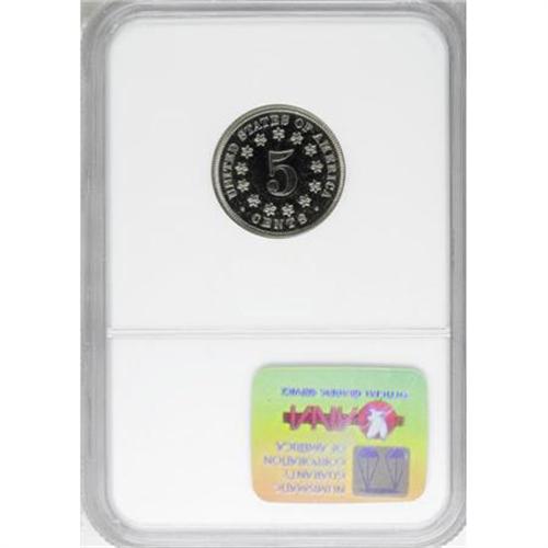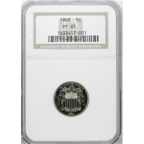 <B>1868 5C PR65 NGC.</B></I> Gleaming with boldly impressed devices and whispers of silver-blue against the bright nickel-gray surfaces. A delightful Gem, one of just 600 specimens struck. Census: 59 in 65, 22 finer (11/07).<BR><BR><B>Coin Engraver:</B> James B. Longacre<BR><BR><b>Shipping:</b> Coins & Currency (<a target="_blank" href="http://www.heritageauctions.com/common/shipping.php">view shipping information</a>)