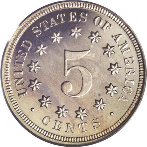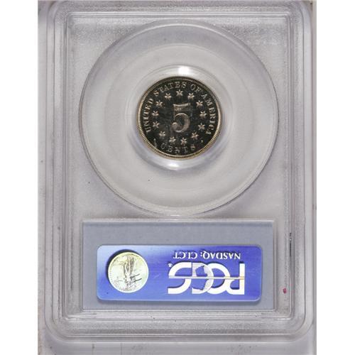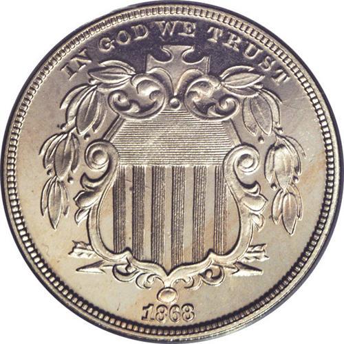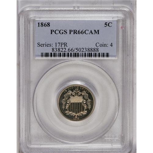 <B>1868<5C> PR66 Cameo PCGS.</B></I> Breen-2475. The date is lightly repunched, most noticeably within the loops of the second 8. Breen mentioned this variety in his <I>Complete Encyclopedia</B></I> as a doubled date. This well struck near-Gem has light hazy patina and modest cameo contrast. Numerous diagonal die lines pass diagonally east-southeast through the areas between the shield stripes, as made. The surfaces are carefully preserved. Population: 11 in 66, 0 finer (7/06).