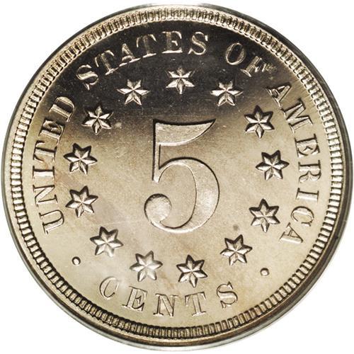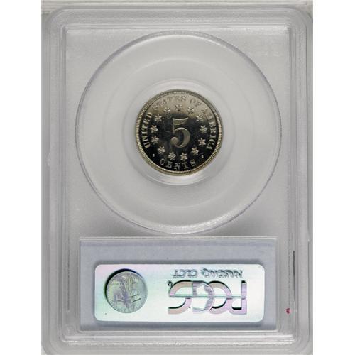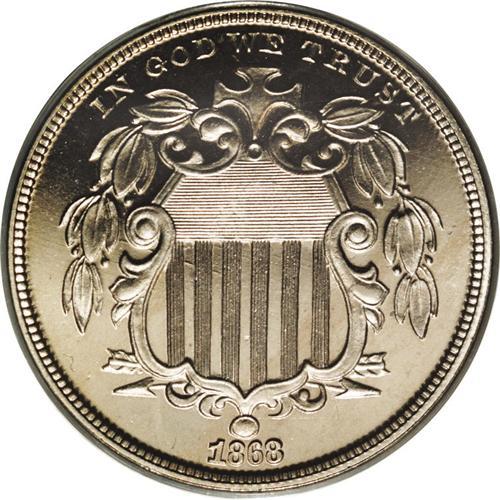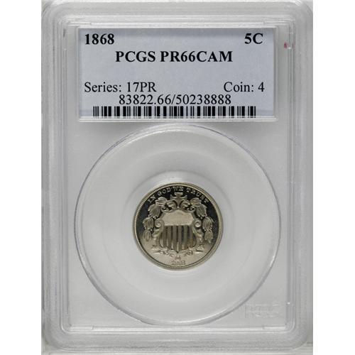 <B>1868<5C> PR66 Cameo PCGS.</B></I> The date is lightly repunched, most noticeably within the loops of the second 8. Breen mentioned this variety at his <I>Complete Encyclopedia</B></I> entry 2475 as a doubled date. A well struck near-Gem that has light hazy patina and modest cameo contrast. The surfaces are carefully preserved. Population: 11 in 66 Cameo, 0 finer (4/06).