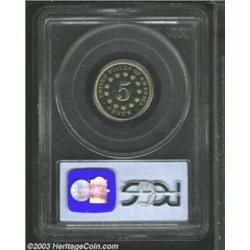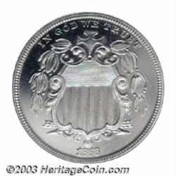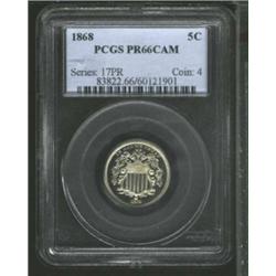<TABLE cellSpacing=0 cellPadding=0 width="100%" bgColor=#000000 border=0><TBODY><TR><TD width="100%"><TABLE cellSpacing=1 cellPadding=3 width="100%" border=0><TBODY><TR><TD width="100%" bgColor=#79735c><FONT face=arial color=#ffffff size=3><B>Description</B> </FONT></TD></TR><TR><TD width="100%" bgColor=#ffffff><FONT face=arial size=2><B>1868 5C PR66 Cameo PCGS.</B></I> Brilliant throughout and very flashy. The fields show exceptionally deep mirrors while the devices are deeply frosted, which in turn produces a noticeable cameo effect on each side. The coin is essentially perfectly preserved with no obvious or distracting hairlines or contact marks on the obverse or reverse. Population: 3 in 66, 0 finer (8/03). </FONT></TD></TR></TBODY></TABLE></TD></TR></TBODY></TABLE><BR><A name=PricesRealized></A><TABLE cellSpacing=0 cellPadding=0 width="100%" bgColor=#000000 border=0><TBODY><TR><TD width="100%"><TABLE cellSpacing=1 cellPadding=3 width="100%" border=0><TBODY><TR><TD width="100%" bgColor=#79735c><A name=PR><FONT face=arial color=#ffffff size=3><B>Previous Prices from Heritage Auctions</B> </FONT></A></TD></TR><TR><TD bgColor=#f6f6ed><TABLE cellSpacing=0 cellPadding=0 width="100%" border=1><TBODY><TR><TD align=middle width="33%"><B>Date</B></TD><TD align=middle width="33%"><B>Service</B></TD><TD align=middle width="33%"><B>Price</B></TD></TR><TR bgColor=whitesmoke><TD width="33%"><B>07/09/2002</B></TD><TD width="33%">NGC</TD><TD width="33%">$2,760.00</TD></TR></TBODY></TABLE></TD></TR><TR><TD bgColor=#ffffff><FONT face=arial size=1 ?>PLEASE NOTE: All prices realized reflect the final hammer price PLUS the buyer's premium in auctions that charge a buyer's premium. Each item has a notation at the top of the listing indicating whether that lot included a buyer's premium. Example: A item that sells with a final hammer price of $100 and a 20% buyer's premium will display with a price realized of $120. All information listed is intended to be as accurate as possible, but errors are possible. Please use this guide carefully and inform us of any inaccuracies. </FONT></TD></TR></TBODY></TABLE></TD></TR></TBODY></TABLE><BR><TABLE cellSpacing=0 cellPadding=0 width="100%" bgColor=#000000 border=0><TBODY><TR><TD width="100%"><TABLE cellSpacing=1 cellPadding=3 width="100%" border=0><TBODY><TR><TD width="100%" bgColor=#79735c colSpan=6><FONT face=arial color=#ffffff size=3><B>Price Guide*</B> </FONT></TD></TR><TR bgColor=#f6f6ed><TD align=middle><B>Grade</B> </TD><TD align=middle><B>Coin World<BR>(Trends)</B> </TD><TD align=middle><B>Numismedia<BR>Retail</B> </TD><TD align=middle><B>Numismedia<BR>Wholesale</B> </TD><TD align=middle><B>Coin<BR>Universe</B> </TD><TD align=middle><B>Heritage<BR>Value Index</B> </TD></TR><TR bgColor=#ffffff><TD align=middle>65</TD><TD align=right>---</TD><TD align=right>---</TD><TD align=right>---</TD><TD align=right>---</TD><TD align=right>$1,293.75</TD></TR><TR style="FONT-WEIGHT: bold" bgColor=#cccfdd><TD align=middle>66</TD><TD align=right>---</TD><TD align=right>---</TD><TD align=right>---</TD><TD align=right>---</TD><TD align=right>---</TD></TR><TR bgColor=#ffffff><TD align=middle>67</TD><TD align=right>---</TD><TD align=right>---</TD><TD align=right>---</TD><TD align=right>---</TD><TD align=right>---</TD></TR><TR bgColor=#ffffff><TD colSpan=6><FONT size=1>*All information listed is intended to be as accurate as possible, but errors are possible. No item may be returned or refused based on this information which is provided as a service to our customers. You should contact each pricing source directly to determine the accuracy of this information. </FONT></TD></TR></TBODY></TABLE></TD></TR></TBODY></TABLE><BR><TABLE cellSpacing=0 cellPadding=0 width="100%" bgColor=#000000 border=0><TBODY><TR><TD width="100%"><TABLE cellSpacing=1 cellPadding=3 width="100%" border=0><TBODY><TR><TD width="100%" bgColor=#79735c><FONT face=arial color=#ffffff size=3><B>Population Guide</B> </FONT></TD></TR><TR bgColor=#ffffff><TD align=middle><!-- Begin Output of Population Grid--><TABLE cellSpacing=0 cellPadding=0 width="100%" border=0><TBODY><TR><TD vAlign=center><TABLE cellSpacing=0 width="100%" border=1 cellsadding="3"><TBODY><TR><TD vAlign=center><TABLE cellSpacing=0 cellPadding=3 width="100%" border=1><TBODY><TR><TD vAlign=center align=middle bgColor=#f0f1e8 colSpan=2 <CENTER><FONT face=Arial size=2><B>PCGS Pop </B></FONT><CENTER></CENTER></TD><TD vAlign=center align=middle bgColor=#f0f1e8 colSpan=2><CENTER><FONT face=Arial size=2><B>NGC Pop</B></CENTER></FONT></TD></TR><TR><TD vAlign=center><FONT face=Arial size=2>(66)</FONT> </TD><TD vAlign=center align=right><FONT face=Arial size=2>3</FONT> </TD><TD vAlign=center><FONT face=Arial size=2>(66)</FONT> </TD><TD vAlign=center align=right><FONT face=Arial size=2>3</FONT> </TD></TR><TR><TD vAlign=center><FONT face=Arial size=2>(>66)</FONT> </TD><TD vAlign=center align=right><FONT face=Arial size=2>0</FONT> </TD><TD vAlign=center><FONT face=Arial size=2>(>66)</FONT> </TD><TD vAlign=center align=right><FONT face=Arial size=2>1</FONT> </TD></TR></TBODY></TABLE></TD></TR></TBODY></TABLE></TD></TR></TBODY></TABLE><!-- End Output of Population Grid--> Important notice: Heritage usually auctions material at the rate of 200-250 lots per hour. On some occasions eBay Live bid software or the Internet may not be able to keep up with the pace of the auction. We recommend placing a realistic absentee bid now as insurance to avoid disappointment. Occasionally the auctioneer may eliminate or reject an eBay Live bid, and the auctioneer may also reopen a lot after the close of the eBay live bidding (usually because we missed an audience bid), and may reject your bid even if it shows you as the winning bidder. By bidding via eBay Live, you agree that Heritage may award the lot to another bidder at its sole discretion under the circumstances described above or any other reasonable circumstances. Also please note that all Heritage lots purchased through e