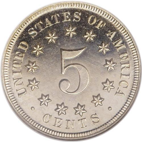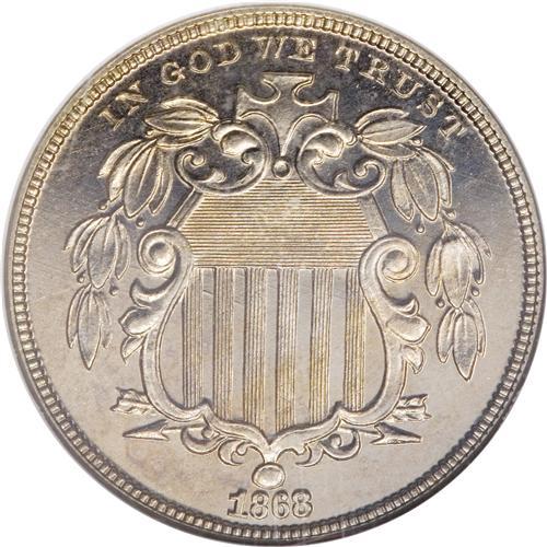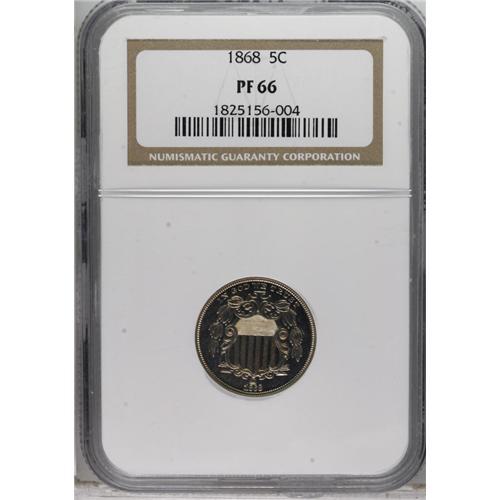 <B>1868 5C PR66 NGC.</B></I> The date is noticeably repunched. A lightly toned and needle-sharp Gem that is essentially pristine overall. Both sides are deeply mirrored with a hint of cameo contrast beneath pleasing pale champagne color. Few finer proof examples of this date have been certified by either NGC or PCGS.<BR><BR><b>Shipping:</b> Coins & Currency (<a target="_blank" href="http://www.heritageauctions.com/common/shipping.php">view shipping information</a>)