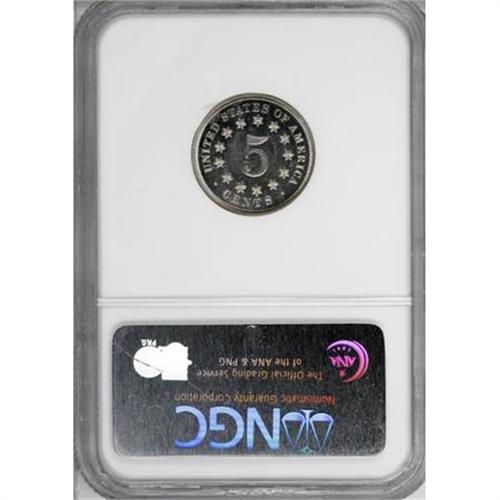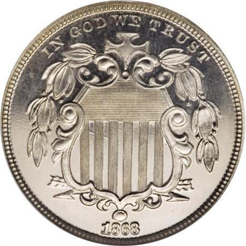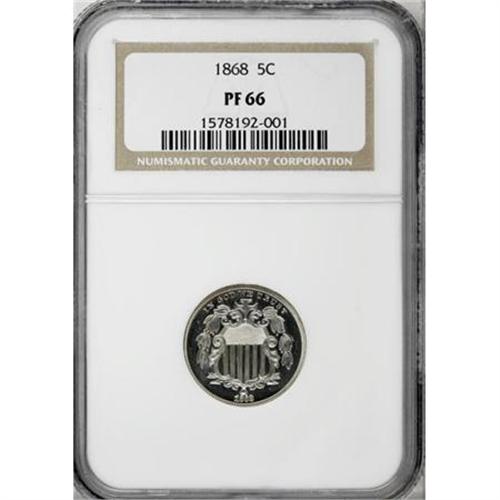 <B>1868 5C PR66 NGC.</B></I> A wonderful example of this early proof Shield nickel, with just a dusting of tan coloration over highly reflective fields and powerfully frosted devices. The obverse demonstrates pleasing cameo contrast while the reverse is more uniform in its reflectivity. Rarely encountered any finer. Census: 20 in 66, 2 finer (11/07).<BR><BR><B>Coin Engraver:</B> James B. Longacre<BR><BR><b>Shipping:</b> Coins & Currency (<a target="_blank" href="http://www.heritageauctions.com/common/shipping.php">view shipping information</a>)