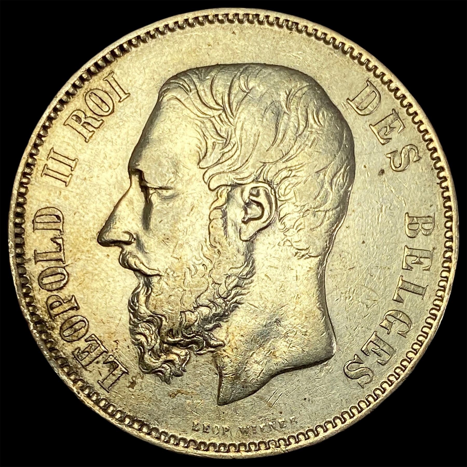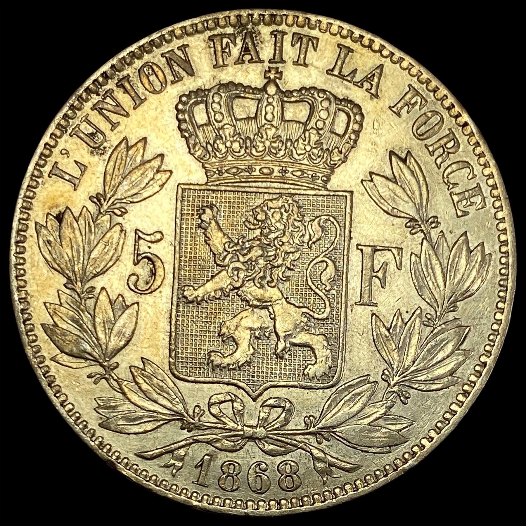 1868 Belgium Silver 5 Francs CLOSELY UNCIRCULATED