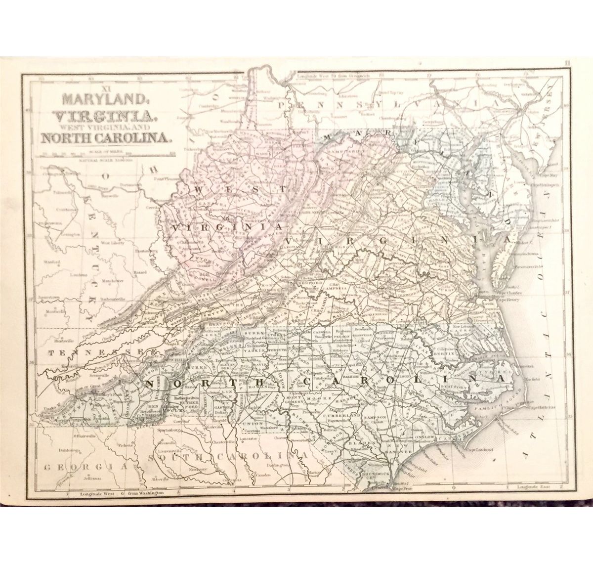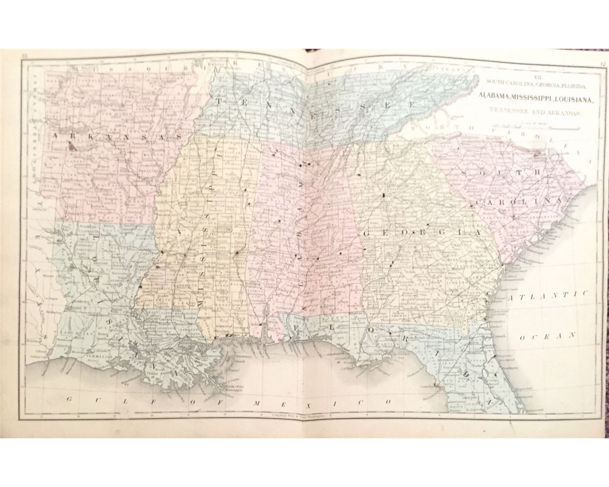 1868 Copperplate Map from Mitchell's Modern Atlas of North Carolina, Georgia, Florida, Alabama, Mississippi, Louisiana, Tennessee and Arkansas (Texas, Maryland, Virginia and West Virginia are on the backside)