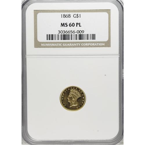 <B>1868 G$1 MS60 Prooflike NGC.</B></I> Strictly no trace of wear appears on this coin, and short of using a loupe, the surfaces appear fully prooflike and deserving of a significantly finer grade, with radiant luster and pleasing yellow-gold color. Under said loupe, fine field chatter and microabrasions appear, but the appeal remains. The 1868 gold dollar was minted to the extent of only 10,500 business strikes plus 25 proofs. Mint State specimens are decidedly scarce.<BR><BR><b>Shipping:</b> Coins & Currency (<a target="_blank" href="http://www.heritageauctions.com/common/shipping.php">view shipping information</a>)