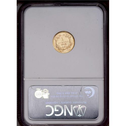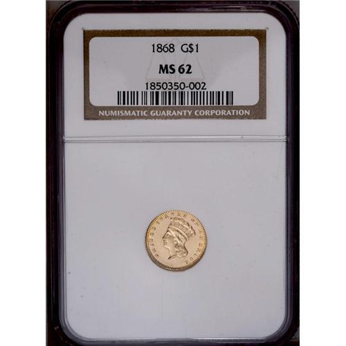 <B>1868<G$1> MS62 NGC.</B></I> A gold-green piece with slight reflectivity on both sides, though not enough for the designation. Sharply struck and quite pleasing overall.